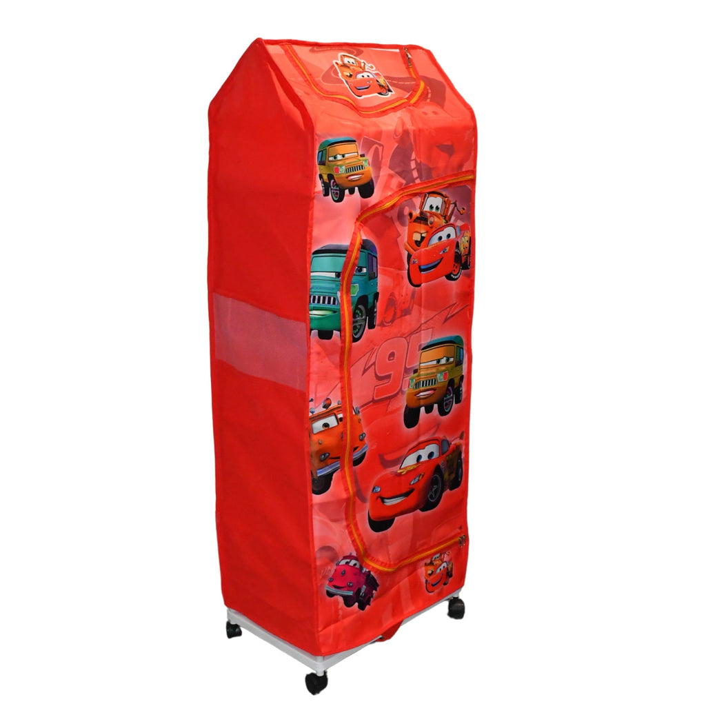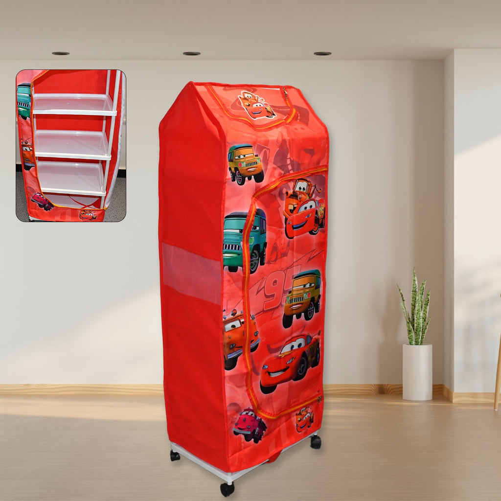 Multi Purpose Foldable Baby Wardrobe / Toy Box 5 Shelves Cartoon Printed, Red, Hut Shaped (Plastic Structure and Non - Woven Fabric Cloth Shelf)