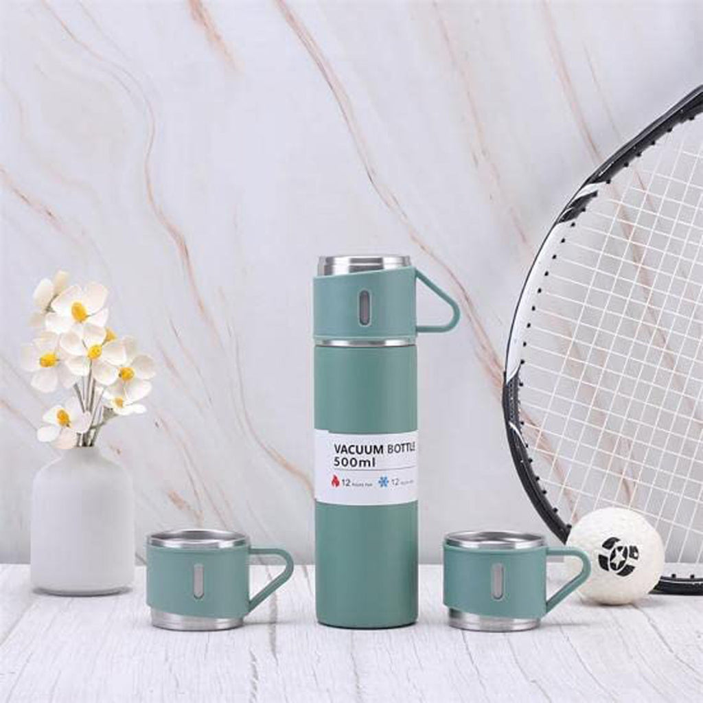 Vacuum Insulated Flask Set with 3 Cups– Keep Drinks Hot or Cold for 24 Hours, Ideal for Coffee, Tea, Milk, with Leak-Proof Design and Portable Travel-Friendly Build (Green) (1 Pc / 500ml)